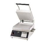 Pro-Max Panini Grilll, electric, 14" x14" fixed lower grill, hinged upper grill, grooved hardened aluminum grill plates, termostatic control w/off position, distinctive grid patterns create attractive sear marks on panini sandwiches, hamburgers, chicken breasts, and other food products; heavy duty aluminum platens provides superior performance and long life; thermostat is rated from 175 to 550; front grease trough and drawer for convenient operation; 15 1/4''w x 24 3/4. ( Star - CG14120 )