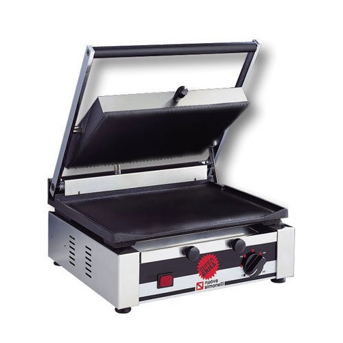 The 15" Smooth Panini Grill (APL10TL2E1) is an expertly crafted panini grill from Nuova Simonelli. Manufactured in Italy, this authentic panini grill is a full fifteen inches wide and has a cooking area of 140 square inches giving you plenty of room to grill on. This grill also features a smooth grill plate to maximize the cooking surface. Made from high quality cast iron, the grill plates provide superb heat retention and distribution for unmatched grilling power. Additionally, the body of the grill is constructed from 18/8 stainless steel for remarkable durability and corrosion resistance. Features: 14" x 10" cooking surface, Smooth grill panels, 18/8 stainless steel body construction. Benefits: Pull out drip and crumb tray for easy cleaning, Fully insulated handle prevents injury, Both the top and bottom plates are heated for ideal heat distribution.