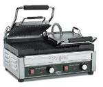 Italian Ottimo Dual Panini Grill, electric, double, 17" x 9.25" cooking surface, hinged auto-balancing top plate w/ heat resistant handles, ribbed cast iron plates, adjustable thermostats 570 F (300 C), indicator lights, brushed s/s body & removable drip tray, 240V, 13amps, UL, NSF. ( Waring - WPG300 )