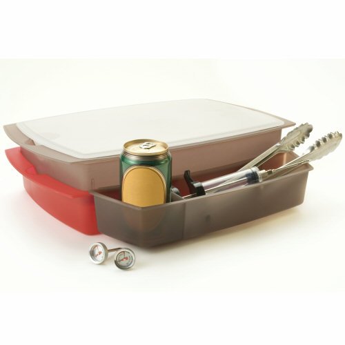 The Charcoal Companion Grill Station helps prevent food cross-contamination and keeps your condiments and accessories handy. Use it to separate raw and cooked food, or use one tray for ice and the other above it to keep food cold for serving. 4-piece set includes: tray marked Raw with raised ridge lines to help food marinate evenly tray marked Cooked with labeling surface to mark contents and date with dry-erase pen clip-on side caddy for sauces, tongs and BBQ brush lid that fits both trays 16x4 1/4;x12inch . Accessories and dry-erase pen not included. Charcoal Companion Grill Station is dishwasher-safe and imported. Available in colors: Black/rd. Available from JCPenny.