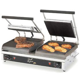 Star Grill Express Panini Grill Press - Dual 10" x 10" - Smooth Top and Bottom - Cast Iron - 208-230 Volts - GX20IS Heavy duty cast iron platens, smooth or grooved, for long life and ultimate performance. *Accurate cooking temperature with an adjustable thermostat from 150º to 450º *Elements embedded within the cast iron platens for excellent heat distribution and fast recovery. *Versatile grilling height to accommodate the flattest tortilla to a 3" sandwich. *The bottom platen is equipped with a patterned 3/4" splash guard for maximum protection against grease spills while keeping food on the grill. *A reliable hinge system for effortless operation and consistent application of pressure for ideal cooking performance. *Large heat resistant handle for safe operation of the top platen. *Easy clean up with a removable grease tray located in front of the bottom platen. Warranty: One year parts and labor warranty.Dimension: 28-3/4" Wide x 19-7/8" Deep x 10-7/8" Tall (closed) - 21-13/16" Tall (opened)Electrical: 208-240 Volts - 2700-3600 Watts - 13-15 Amps - 6-20P Nema